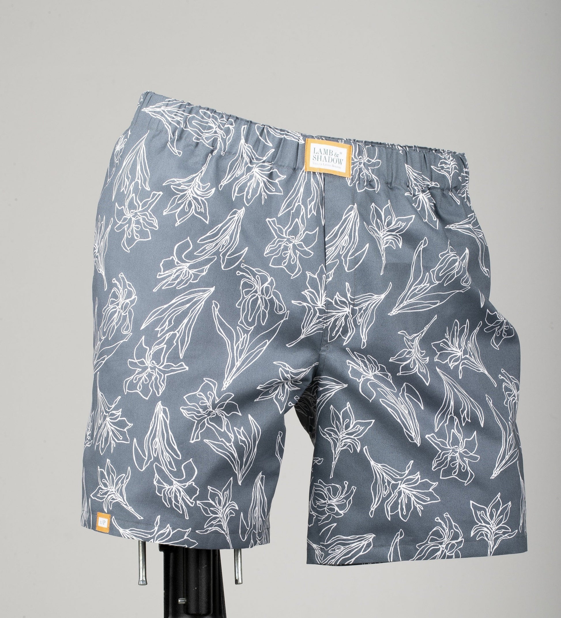 Boxer Short mit Innenfutter und Eingriff, gefertigt aus bedruckter Baumwolle mit leichtem Schimmer.